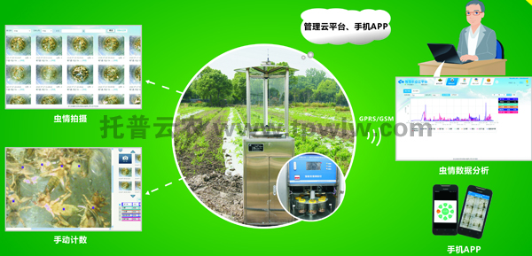 ?????? 托普云农虫情测报灯6.0,能够自动拍照将现场拍摄的图片无线发送至监测平台,通过手机、电脑即可查看,无需下田;手动分类计数,转仓及报警,数据可生成报表形式,清晰直观查看所有虫情监测设备的监测数据。