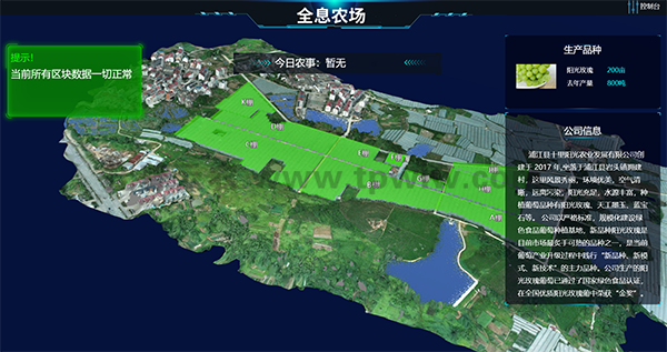 作为智慧农业的升级版本,“超级农场”项目对生产经营管理等每一个环节,都进行了严格的监管,数据采集,实时监测。通过无人机的航拍,实现了对整个农场的3D建模,把整个农场分成A—K,差不多11个区块,然后进行区块的数字化监控。一块电子显示屏就可看到农场的所有状况,葡萄园11个钢架大棚所有环境信息,包括温度、湿度、土壤酸碱值、光照等情况都呈现在屏幕上。另外,葡萄园里各处分布了多少摄像头,有多少在职人员,多少外来人员,也都能一目了然。