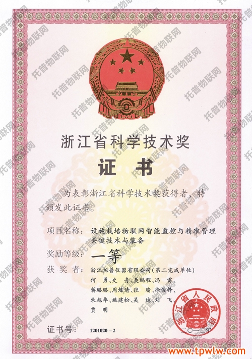- 托普仪器科研项目荣获2012年省科技奖一等奖发表日期:2013-08-20 来源:托普云农 浏览次数:20342次为了鼓励科学技术创新,促进科学技术进步和社会经济发展,根据《浙江省科学技术奖励办法》,托普仪器的科研项目——《设施栽培物联网智能监控与精准管理关键技术与装备》,经过省科学技术评审委员会审定,被评为2012年度浙江省科学技术奖一等奖。