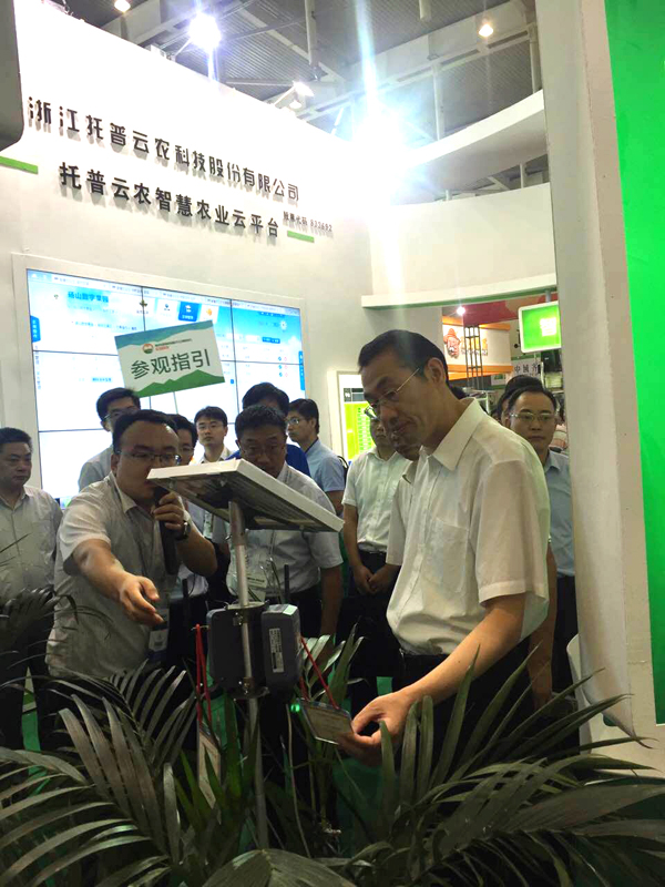 展会期间,南京市委常委、常务副市长刘以安,江苏省农业委员会副主任李俊超,南京市农业委员会主任方中友,等人先后莅临托普展区,参观视察托普云农农业物联网系统。现场工作人员为其进行详细讲解。工作人员以“砀山数字果园”为例,介绍了托普云农在砀山数字果园从农业生产、管理、农产品销售到农产品质量安全追溯等环节中所应用的系统设施以及系统应用后果园取得的效益,以点带面具象化的介绍了智慧农业实现节本增效的途径。托普农业物联网的实施应用受到了多方肯定。