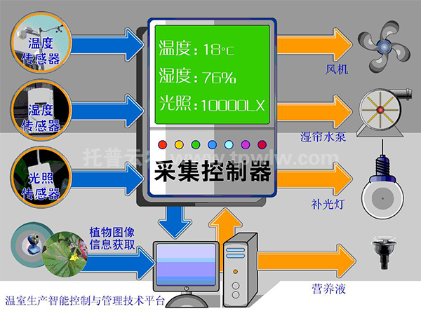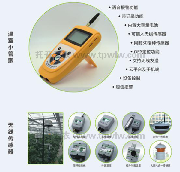 传感器包括无线空气温湿度传感器、光合有效辐射传感器、传感器、超高频RFID读卡器、摄像头等。