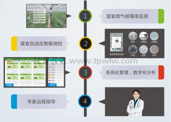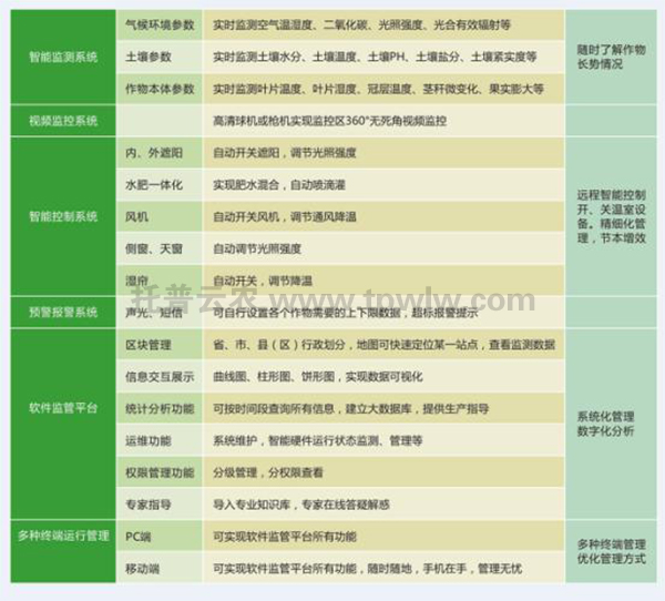 对于大规模的温室化种植而言,单靠人工管理需要大量人手,耗力费时,并且存在难以避免的人工误差。物联网系统采集温室内的空气温湿度、土壤水分、土壤温度、二氧化碳、光照强度等实时环境数据,通过中继节点传输到控制中心,由中心平台系统将最新监测数据与预先设定适合农作物生长的环境参数进行比较,比如发现传感器检测到的数据与预设数值有了偏差,计算机会自动发出指令,只能启动系统相连接的通风机、遮阳、加湿、浇灌等设备的工作,直到大棚内环境数据达到系统预设的数据范围之内,相关设备才会停止工作。