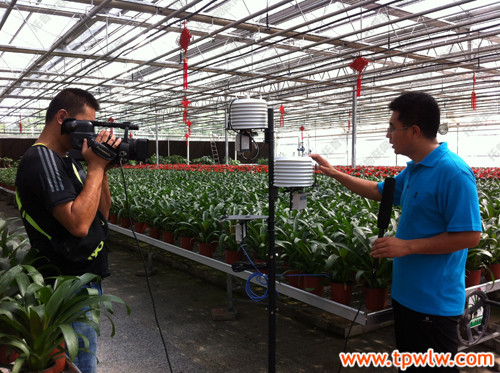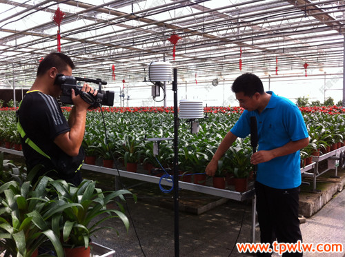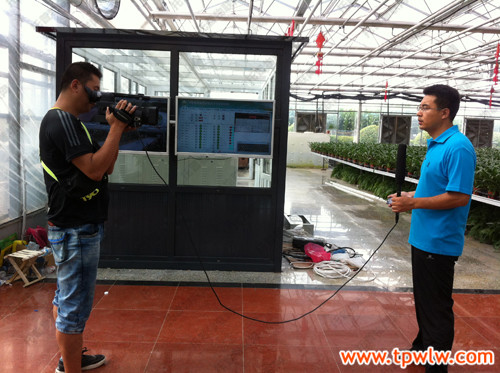 记者:所谓物联网,其实简单的说就是物物相连,互相感知。大家看我身后的一组探头(托普仪器固定式无线农业气象综合监测站),包括这个是测量温度的,这个是测量土壤墒情的,上面还有测量二氧化碳浓度的,测量光照强度的。那这些测量数据都会上传到我身后的中央控制室内的计算机里,通过计算机的计算,再控制风扇、喷灌…这些设备的运转。