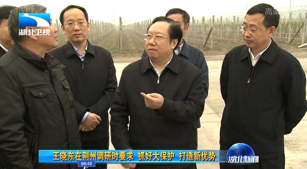 11月17日,湖北卫视《湖北新闻》以《王晓东在荆州调研时要求 抓好大保护 打造新优势》为题,报道湖北省委副书记、省政府代省长王晓东在荆州调研时强调要认真学习贯彻十八届六中全会精神,树立新的发展理念,着力打造发展新优势,走出一条生态优先、绿色发展的新路子。