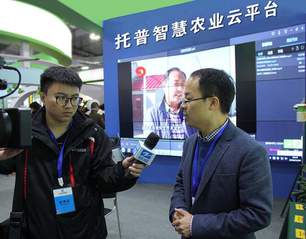 这一番“互联网+农业”的介绍也获得了浙江卫视的关注。记者来到托普云农展位,公司副总朱旭华向记者介绍了公司获得的科研成就及展出的智能化软硬件系统。主要有:托普云农农业“四情”监控系统、设施农业监控系统、水肥一体化监控系统、智慧农业云平台等农业物联网系统、平台及土壤墒情监控系统硬件、农药残留速测仪、相关智能硬件设备(如远程传输智能虫情测报灯、温室通、大田六合一无线传感器、植物本体传感器)。