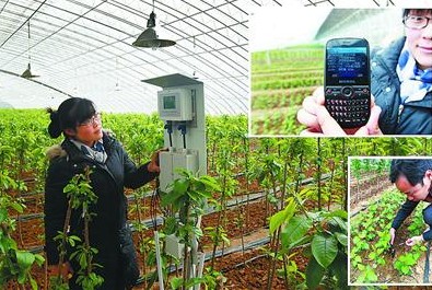 8月24日,管理员在山东省济南市历城区唐王镇高智能温室大棚内查看智能型农业环境通用采集控制器、展示手机召唤短信。近日,一个由太阳能供电的物联网农业信息化高智能温室大棚在唐王镇建成启用。该温室大棚根据不同植物生长条件设定参数,利用棚内设置的气象百叶箱及光照度、二氧化碳和土壤水分等多个探头,定时将数据信息传输给控制系统,及时对棚内进行调节。如遇到大风、大雨等恶劣天气超过设定参数时,便会通过手机进行短信报警,实现了远程监控,确保棚内植物“幸福”茁壮成长。