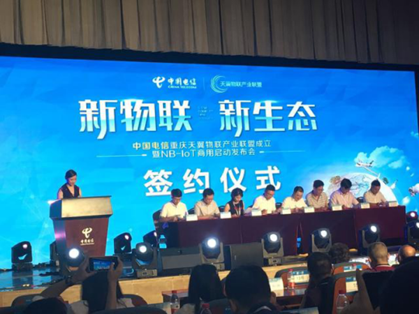 中国电信重庆天翼物联产业联盟成立暨NB-IoT商用启动发布会现场的签约仪式
