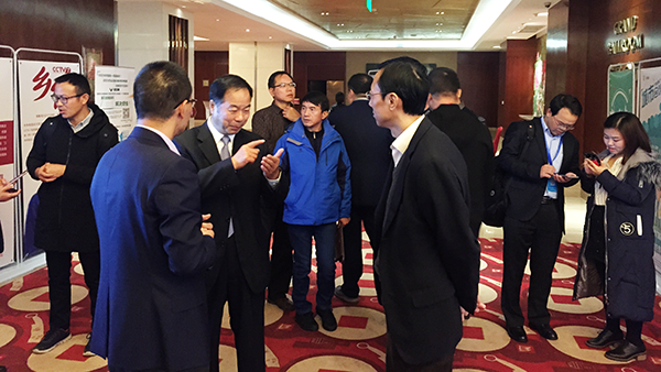 图:托普云农董事长陈渝阳、副总经理朱旭华与农业技术推广协会会长陈生斗等莅临领导就农技推广技术进行交流