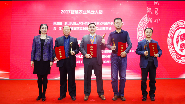随着互联网、物联网为代表的信息经济正强势席卷各行各业,信息技术与农业“连线”,给农业生产、经营、管理带来了深刻变革。在智慧农业发展的新时期,智慧农业需要一批“匠心人物”去推动。年度风云人物的评选作为行业领军人物的角逐,更是异常激烈。在得知获奖后,托普云农董事长陈渝阳表示:“智慧农业风云人物的授予,是政府、产业联盟、行业协会对我个人过去一年成绩的认可,也是对托普云农在智慧农业领域所作出成果的肯定。”图:托普云农副总经理朱旭华(右一)代陈渝阳董事长上台领取2017智慧农业风云人物