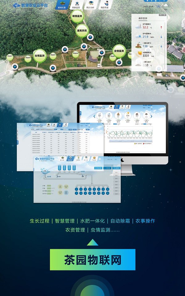 茶园物联网:生长过程,智慧管理。水肥一体化、自动除霜、农事操作、农资管理、虫情监测......
