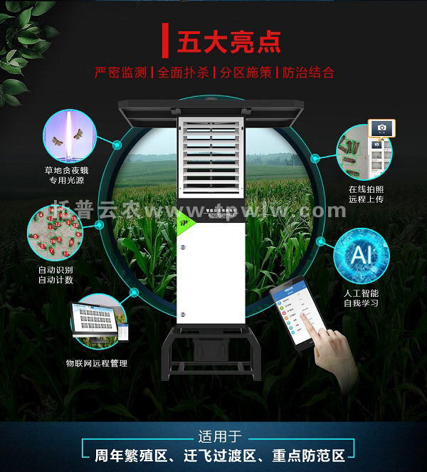 为了预防草地贪夜蛾的入侵,必须用测报灯做好监测。托普云农研发的智能虫情测报灯全新升级重磅上线,具有AI人工智能自我学习功能,采用草地贪夜蛾专用光源,可自动识别自动计数,真正做到严密监测,全面扑杀。在线拍照远程上传,可通过Web或APP随时随地联网管理。