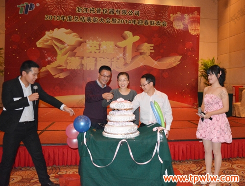 年会晚宴进行到中段,工作人员推上来一个漂亮的三层蛋糕,陈总、婷姐、朱总三人一起切开蛋糕,为托普十周岁生日庆贺。每一位托普家人脸上都绽开幸福的笑容,口中轻唱着欢乐的生日歌,为托普仪器的成长送去诚挚的祝福。图为:公司创始人陈渝阳总经理、朱旭华副总经理、陈丽婷经理切蛋糕庆祝托普十周岁生日