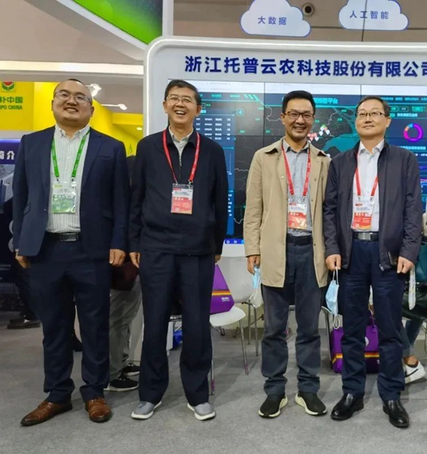 四川省农业农村厅植物保护站尹勇站长(右二)、湖北省植物保护总站郭子平站长(左三)、天津市农业发展服务中心徐建波副部长(左一)、湖北省植物保护总站周华众副站长(左二)莅临托普云农展位