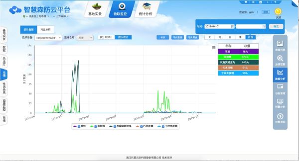 病虫害监测预警系统通过物联网将监测数据实时传输至云平台,在云端实现数据分析与管理。通过统计相应的害虫数量,结合时间,地点等相关信息,可视化展现虫情发生走势图。利用长期积累的数据,林业管理部门通过横向与纵向对比,可以挖掘出虫情爆发期和害虫生活习性等有价值信息,便于对病虫害未来发生趋势进行预测预报,以及时制定防治方案,有效应对重大病虫害疫情的发生。
