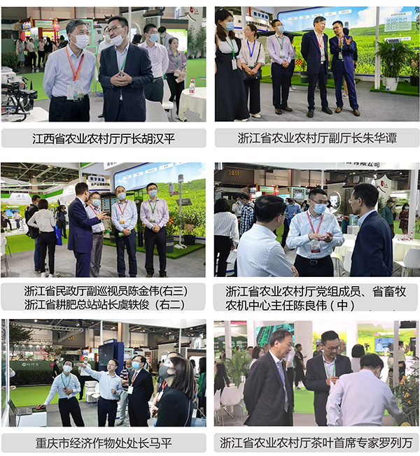 浙江省省委常委、省军区司令员冯文平(左二);浙江省农业农村厅副厅长唐冬寿(左一);浙江省农业农村厅乡村产业与市场信息处副处长程兵(右二)参观托普云农展位