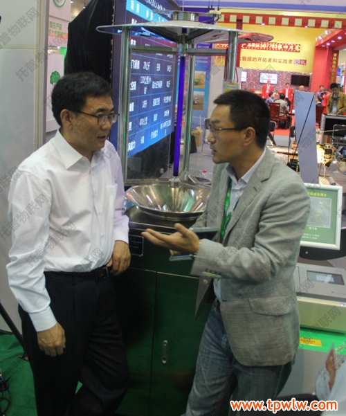 农交会期间,张合成司长一行亲临托普仪器展台考察指导工作,托普仪器陈渝阳总经理详细介绍了此次展出的农业物联网“四大系统”平台:设施农业自动监测与控制平台、农作物病虫害监测预警信息平台、土壤墒情监测与预警信息平台、食品安全监控与追溯信息系统。张合成司长表示,信息化技术是现代农业的重要发展方向,应加强研究力度,提高整体应用水平。图为:张合成司长查看托普农业物联网系统及其传感器