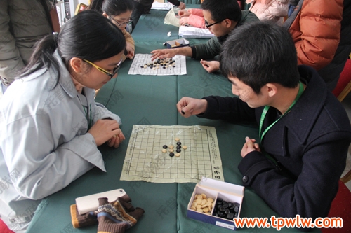 图为:五子棋季军-廖志锋(右)与选手-刘珍(左)比拼