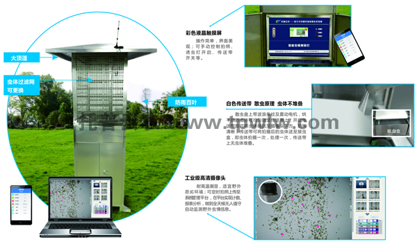 ?????? 远程拍照式虫情测报灯可无公害诱捕杀虫,绿色环保,同时利用GPRS/3G移动无线网路,定时采集现场图像,自动上传到物联网监控服务平台,平台自动记录每天采集数据,形成虫害数据库。可用图表、列表形式展现给农业专家进行远程诊断。工作人员可随时远程了解田间虫情状况,制定防治措施。