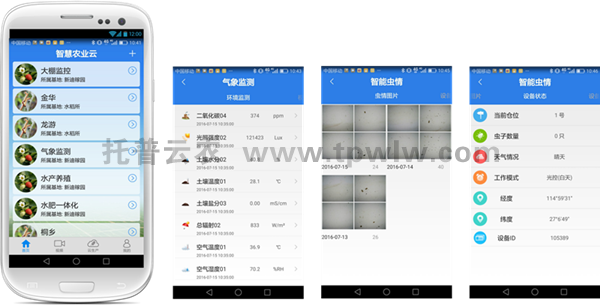 ?????? 托普农业“四情”监测系统/农林“四情”监测预警系统由小型气象站、虫情测报灯、苗情/灾情摄像机、作物生理生态监测仪以及预警预报系统、专家系统、信息管理平台组成。各级用户通过网页、手机即可查询田间虫情、苗情、病情、环境数据。系统联合作物管理知识、作物图库、灾害指标等模块,对作物实时远程监测与诊断,提供智能化、自动化管理决策,是农业技术人员的“千里眼”和“听诊器”。