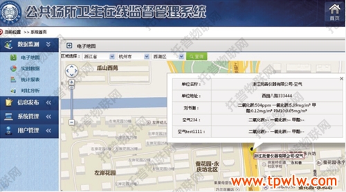公共场所卫生是关系到一个国家或一个地区人民大众健康生活的公共事业。随着时代的发展,空气质量与水污染等问题的日益严重,大众对公共场所卫生问题也越来越重视。托普公共场所卫生在线监测系统包括:登陆窗口、数据监控、信息发布、系统管理、用户管理五个部分,为政府执行国家卫生法律法规、企业提供优质服务、公众享受健康生活方式提供公共场所卫生情况监测、发布、监督的透明信息平台。