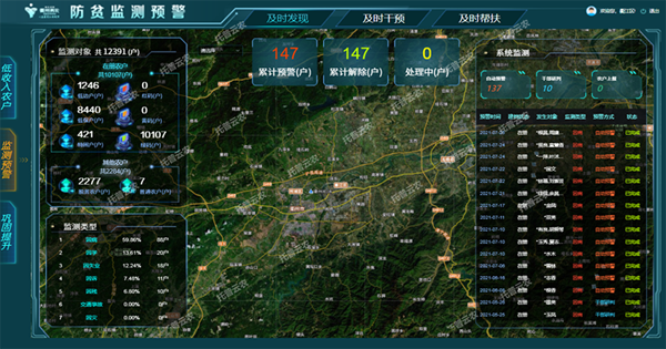 根据不同预警事件设立监测边界、规则、算法,打通医保、残联、教育等主要部门数据,运用各项数据分析低收入农户群体,对大病支出、教育支出、受灾等发起预警,及时提醒扶贫干部走访;打通掌上应用走访数据,实现实时跟踪帮扶情况。