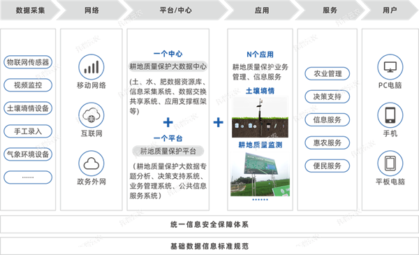 利用“1+1+N”模式,通过信息技术,构建标准化、规范化的耕地质量管理信息系统,构建一个耕地质量保护大数据中心,一个耕地质量保护大数据平台和N个业务子系统。