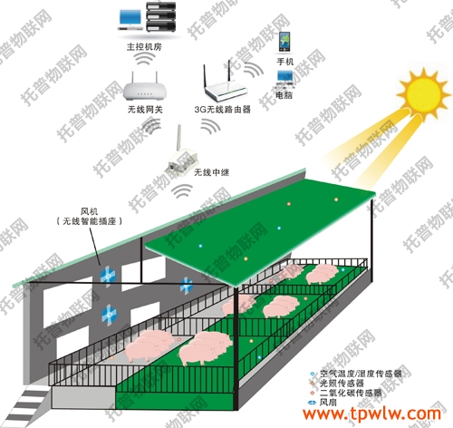 与物联网相连的有各种自动调节设备。当猪舍内照度、温度不在正常设定范围时,可远程控制开启或关闭天窗获取光照与温度,也可实时风机散热;当湿度不够时,则可打开水帘,增加湿度。